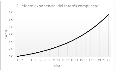 Si hubiésemos invertido 1€ a una tasa del 10% durante 20 años, llegaremos a obtener 3€ en el caso de no reinvertir los rendimientos (interés simple), y de 6,7€ en el supuesto de que hayamos reinvertido los rendimientos (interés compuesto).